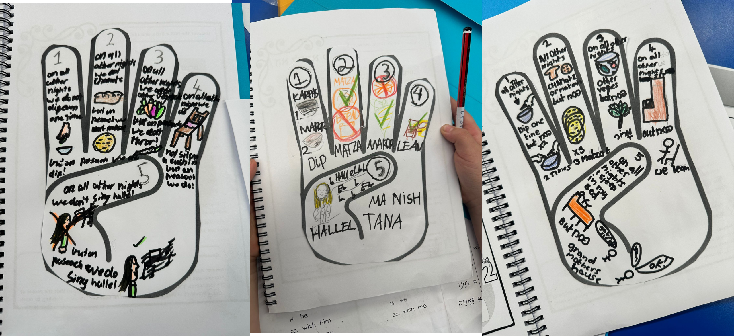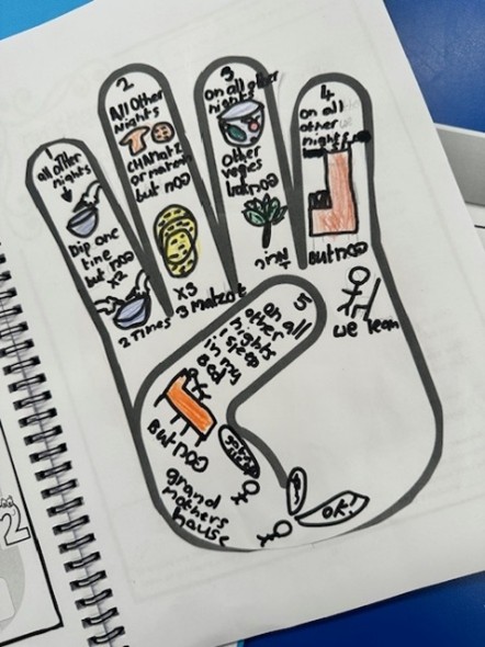Yehudis took the traditional Mah Nishtanah and gave it a creative twist, asking her Grade 3 students to look beyond the printed page to find a personal connection to Pesach. Using a technique called sketch-noting, which she learned about at a workshop with Emily Shapiro Katz on Rimonim’s recent Israel Semester, students mapped out the traditional four questions on the four fingers of a hand-shaped template, reserving the palm and thumb spaces for something new: their Fifth Question.